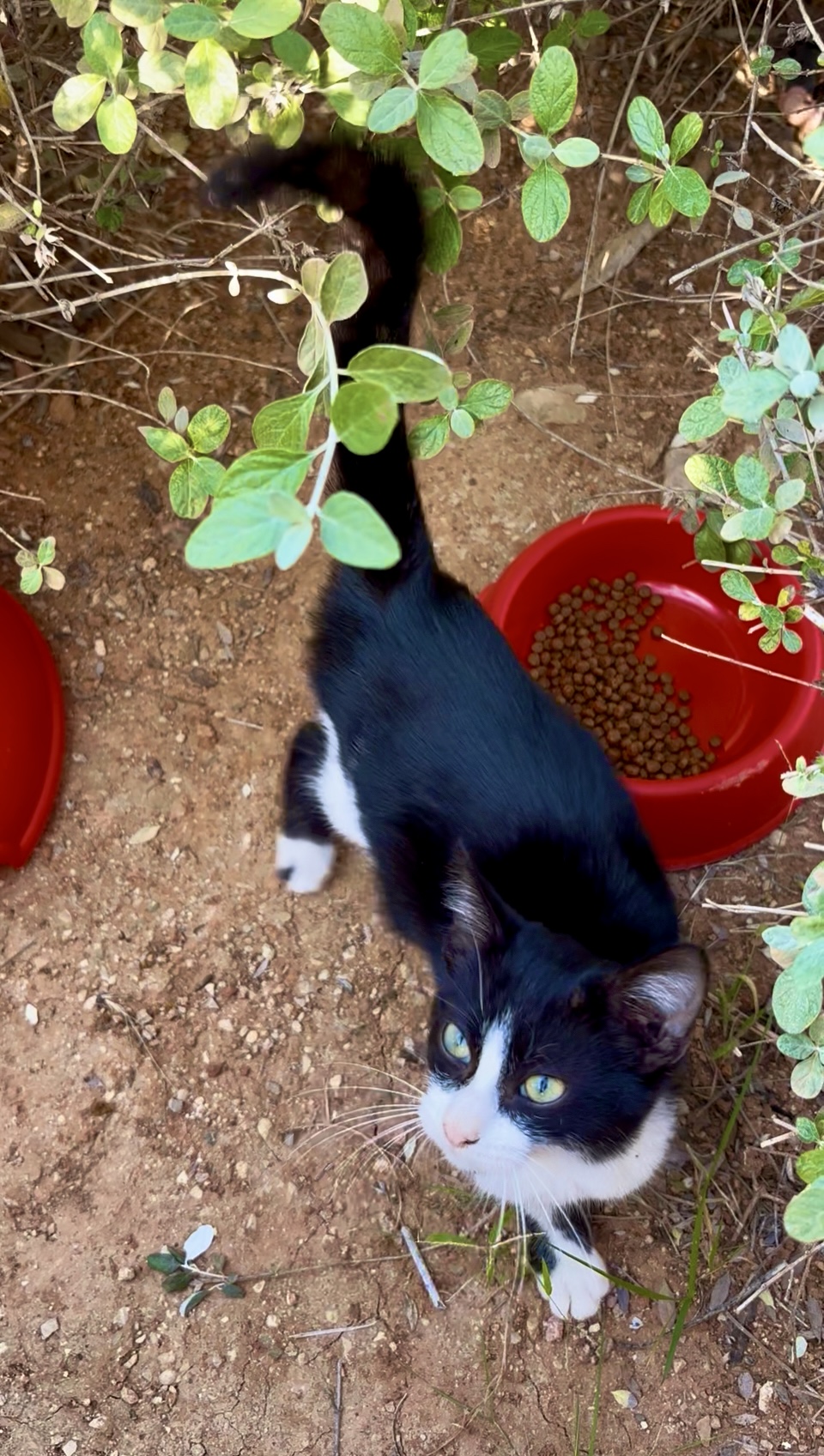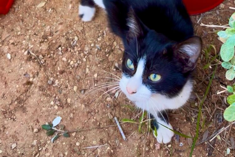 Otra información: Apareció el domingo maullando mucho, como llamando a la madre. Le bajamos comida y agua pero no se dejaba tocar y bufaba mucho, estaba asustado y temblando. Ahora después de unos días de visitarle todos los días y bajarle comida se deja tocar y está muy cariñoso.